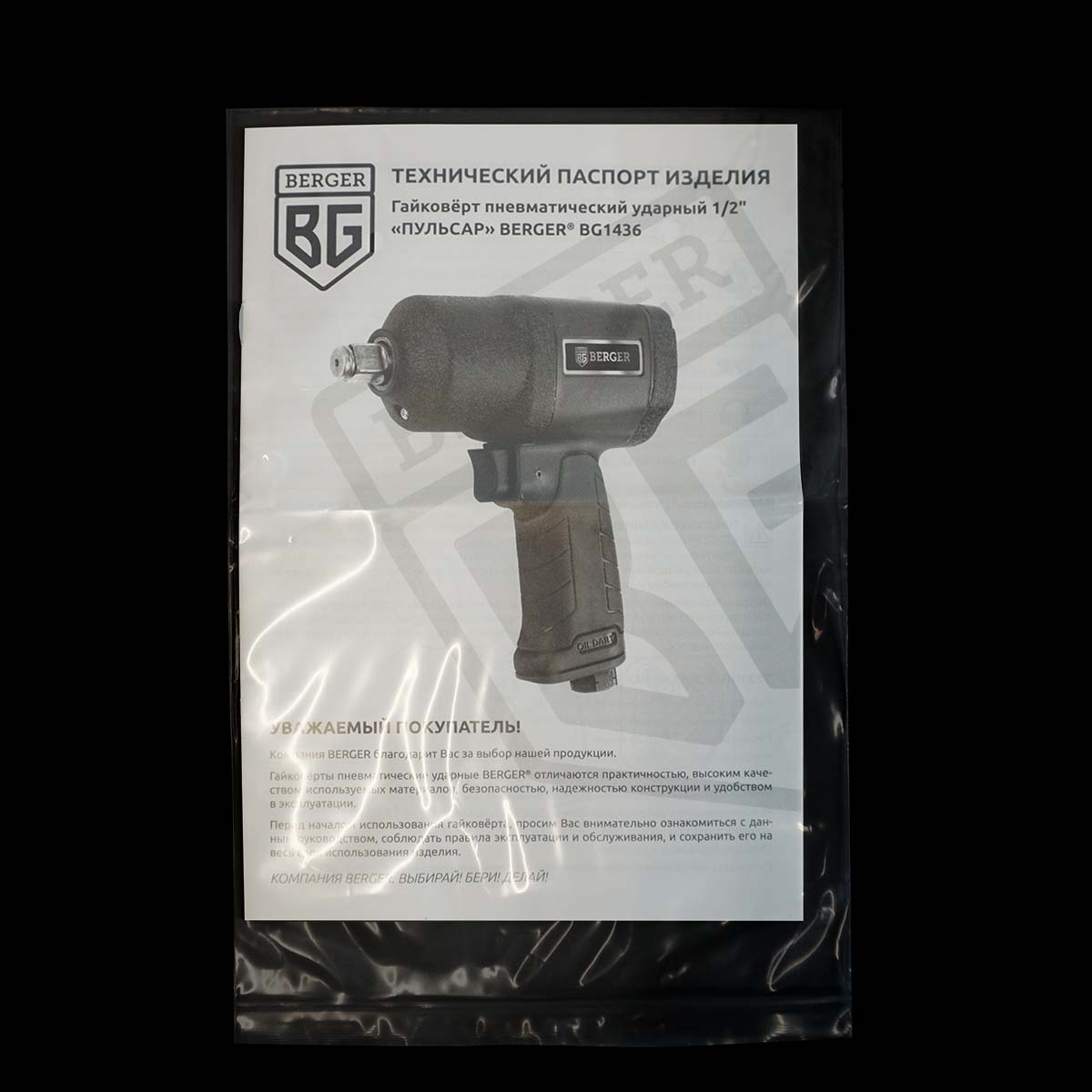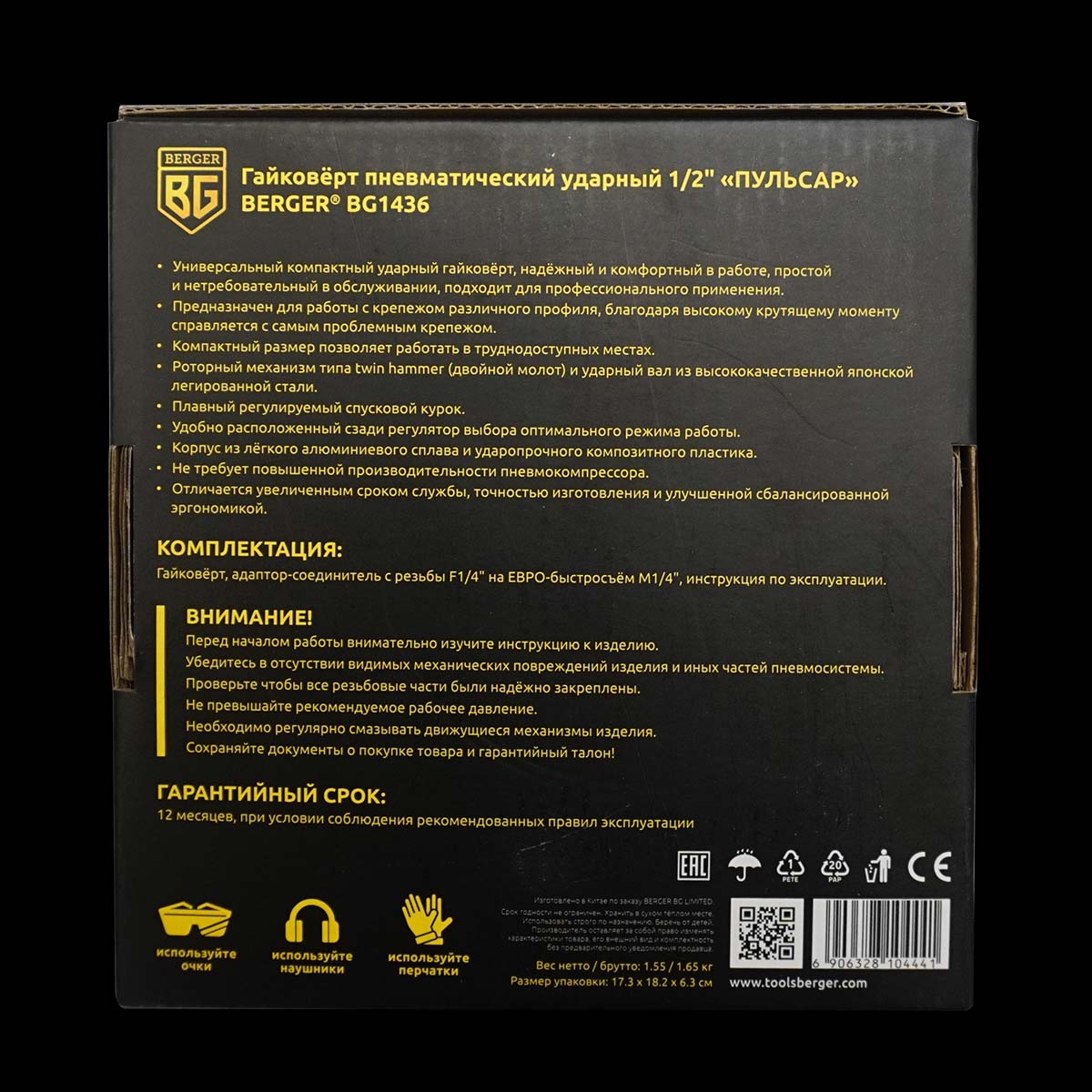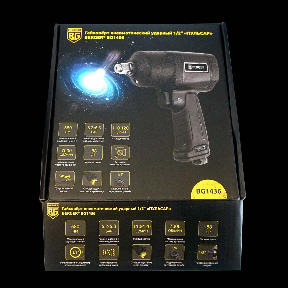ГАЙКОВЁРТ ПНЕВМАТИЧЕСКИЙ УДАРНЫЙ 1/2″ «ПУЛЬСАР» BERGER BG1436 – универсальный компактный ударный гайковёрт профессионального качества, надёжный и комфортный в работе, простой и нетребовательный в обслуживании.