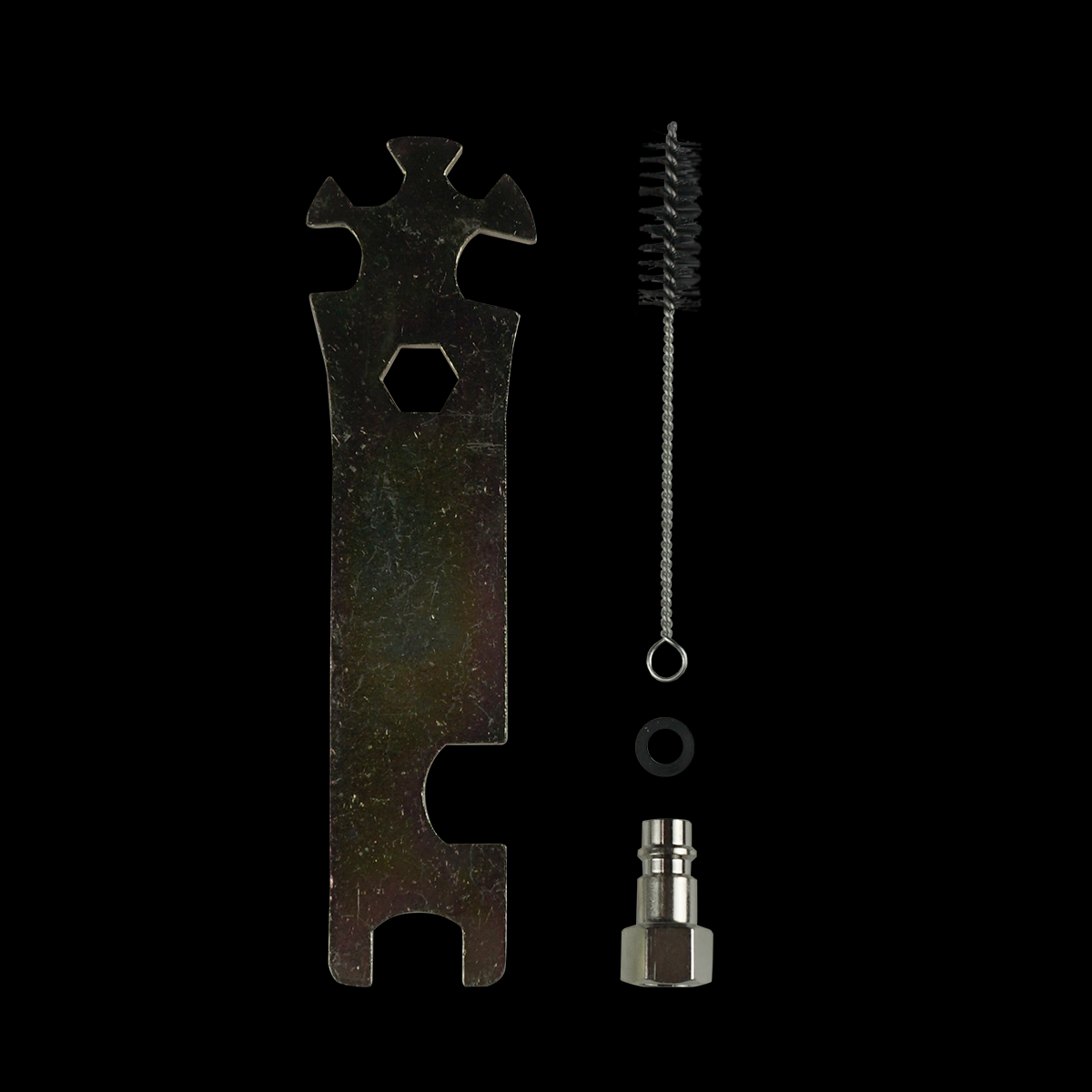 Комплектация: краскопульт, бачок, адаптер-соединитель с резьбы F1/4″ на быстросъём M1/4″, ключ универсальный для обслуживания краскопульта, щётка для чистки, инструкция по эксплуатации.