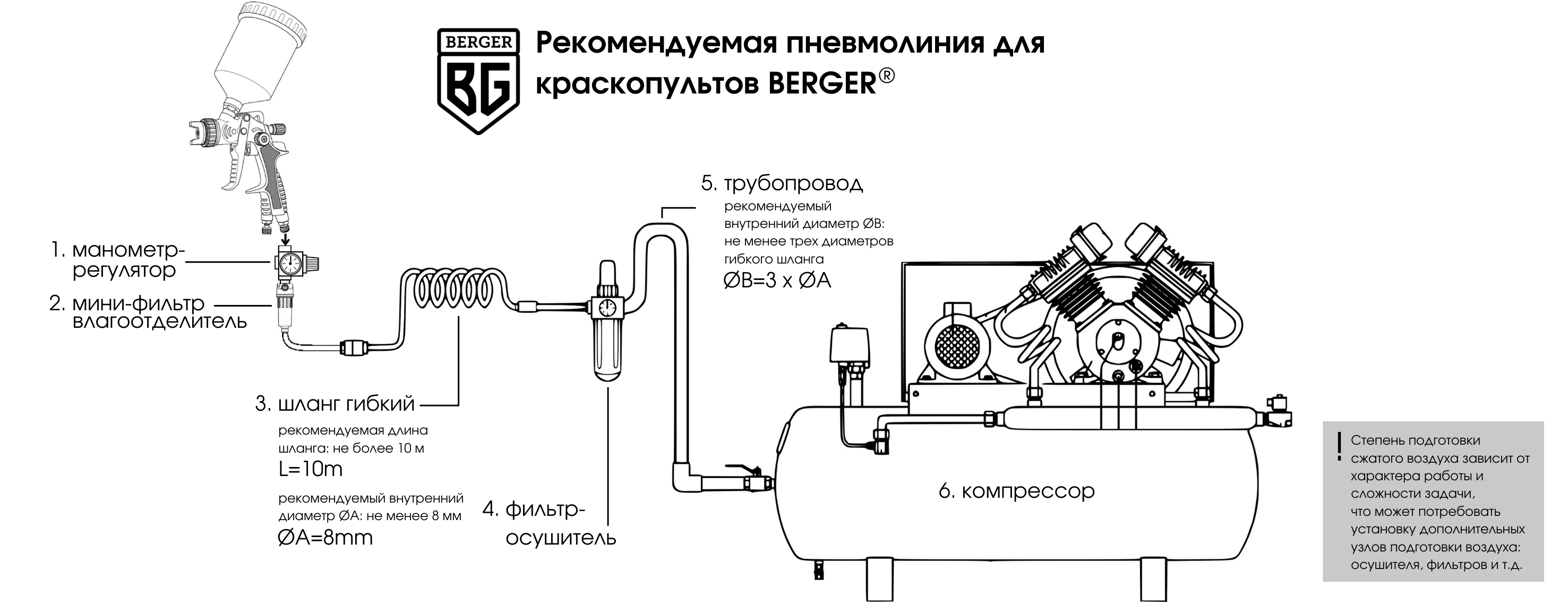 + 3. Шланг спиральный полиуретановый 8×12мм, 10м, РЕЗЬБА F1/4″ BERGER BG1401