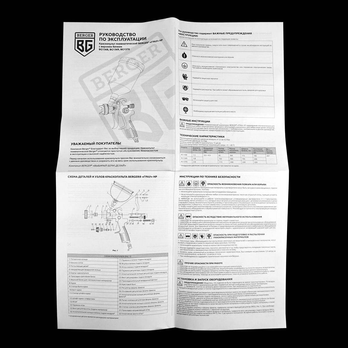 Комплектация: краскопульт, бачок, адаптер-соединитель с резьбы F1/4″ на быстросъём M1/4″, щётка для чистки, инструкция по эксплуатации.