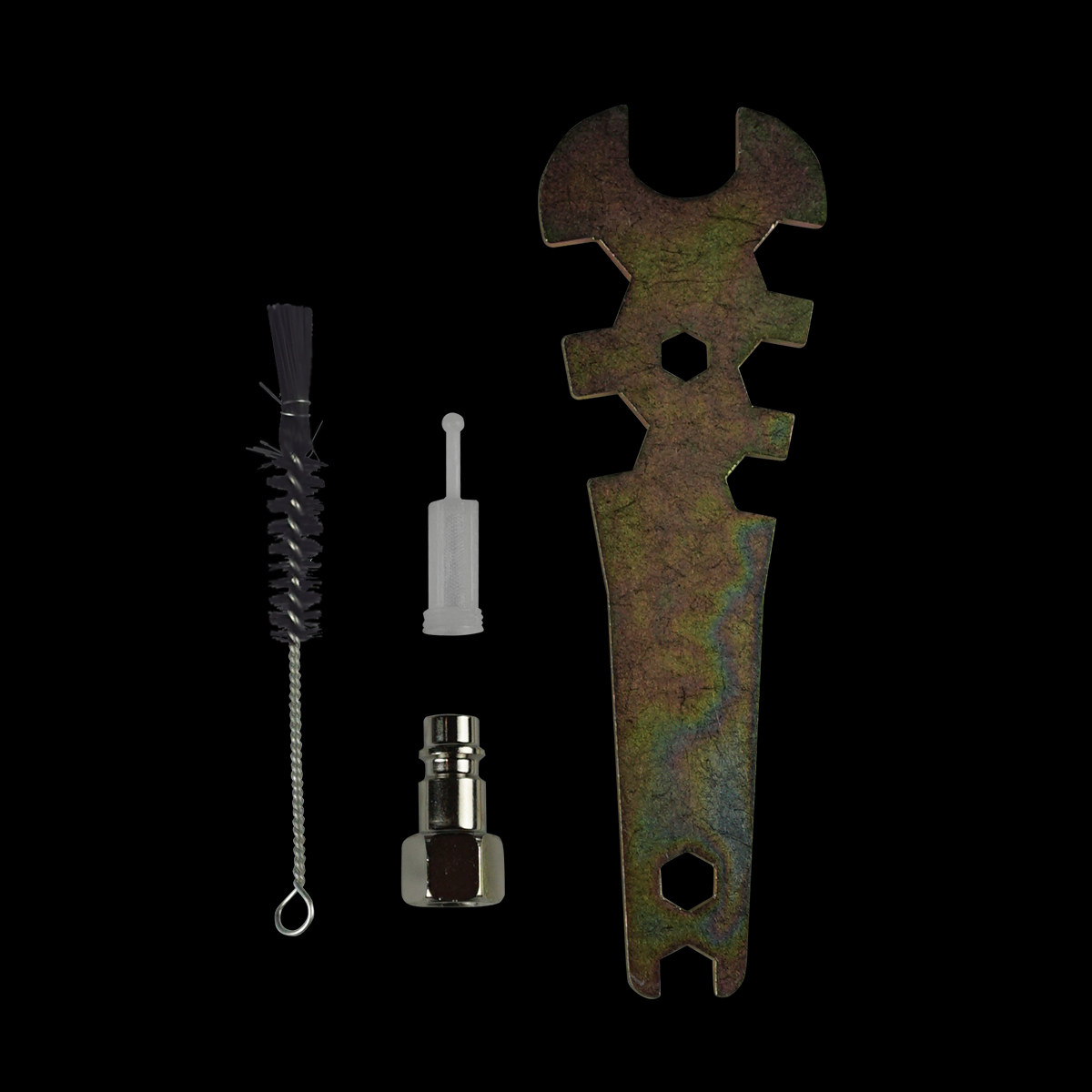 Комплектация: краскопульт, бачок, адаптер-соединитель с резьбы F1/4″ на быстросъём M1/4″, пластиковый мини-фильтр для ЛКМ, ключ универсальный для обслуживания краскопульта, щётка для чистки, инструкция по эксплуатации.