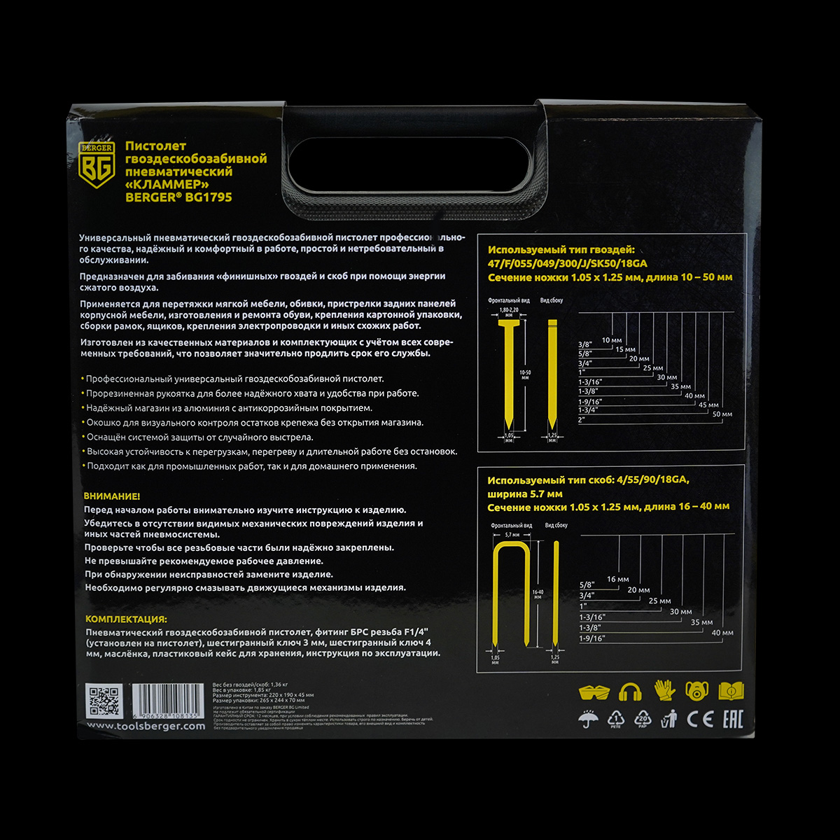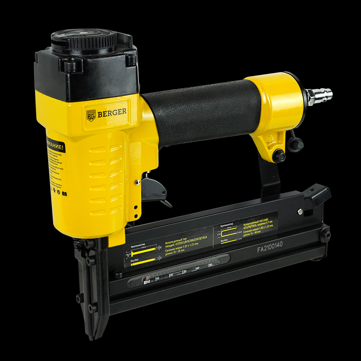 Универсальный пневматический гвоздескобозабивной пистолет BERGER BG1795 профессионального качества, надёжный и комфортный в работе, простой и нетребовательный в обслуживании.