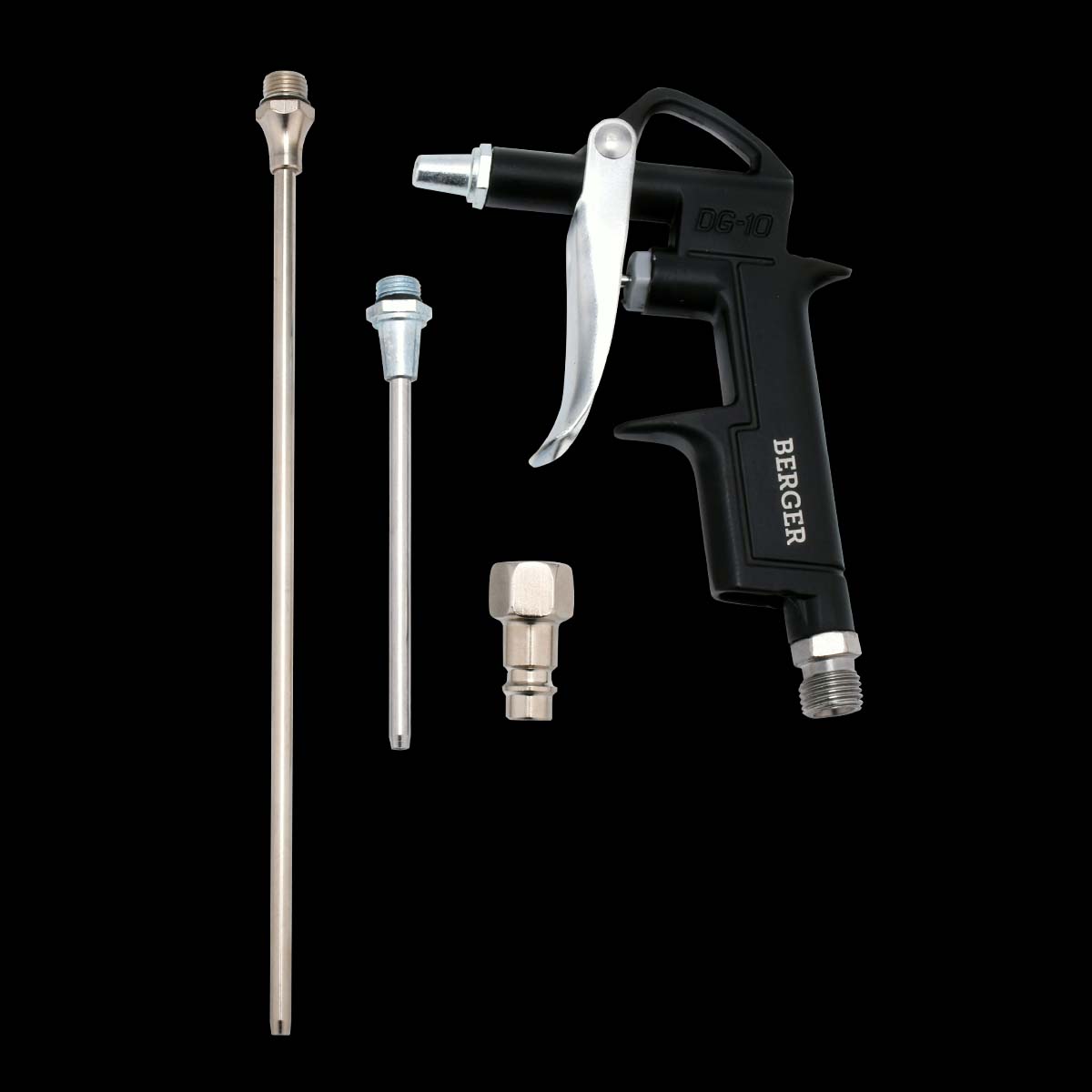 Комплектация: пневматический пистолет, адаптер-соединитель с резьбы F1/4″ на быстросъём M1/4″, три насадки: 16.5, 64.5, 112 мм