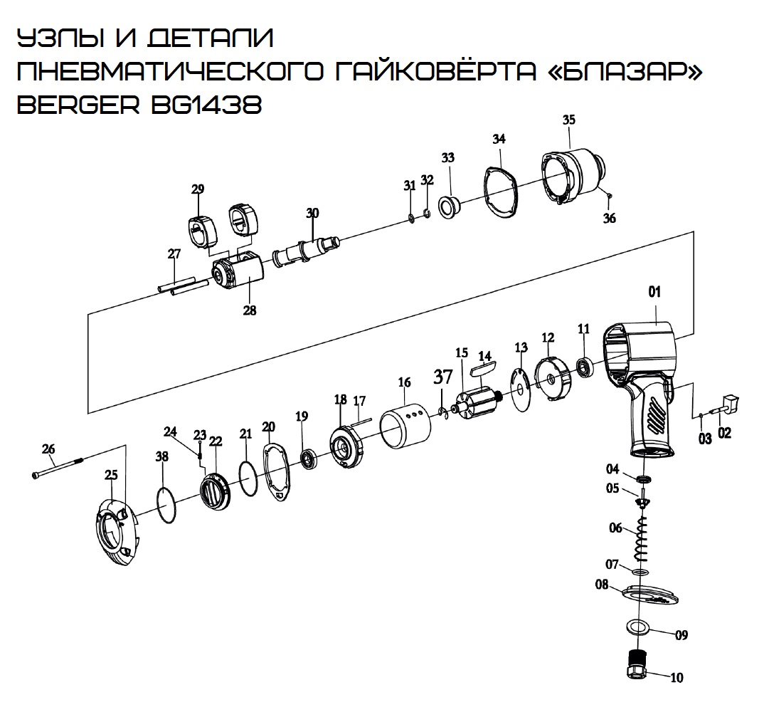 Ремкомплекты, запасные узлы и детали к ГАЙКОВЕРТУ ПНЕВМАТИЧЕСКОМУ УДАРНОМУ 1/2″ 1300 НМ «БЛАЗАР» BERGER BG1438