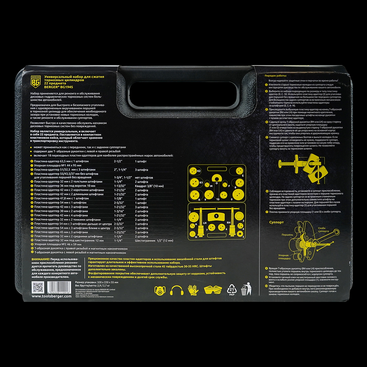 Набор BERGER BG1945 применяется для ремонта и обслуживания дисковых гидравлических тормозных систем большинства автомобилей.